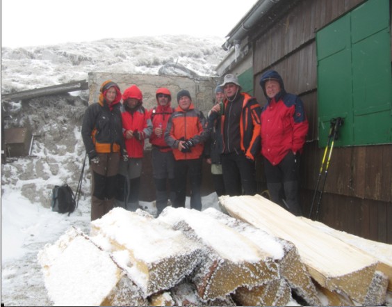 Po težko pričakovani priključitvi zapoznelega dela skupine, saj smo bili trije vrli udje premraženi že do kosti, smo se skupaj z njimi odpravili kakih 400 metrov niže, kjer so bile vremenske razmere že kar spodobne, kjer so si lahko postregli z malo zapoznele hrane, ki je še kako prijala.