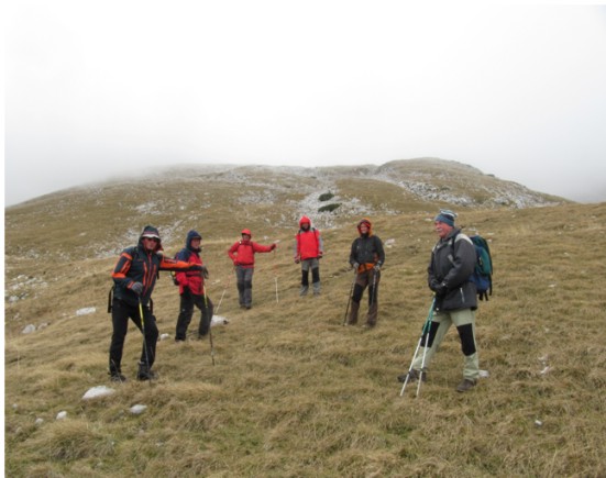 V avanturo smo se najprej podali: Bojan, Lojze in Franci. Del celjske ekipe z Jožetom, ki je bil današnji vodnik v gore, je malo zamujala in nam je sledila s polurno zamudo. Bili smo, prepričani, da nas bodo mimo grede dohiteli, pa smo se vendar ušteli. Verjetno smo sebe kar pošteno podcenjevali, kajti šele po dobri uri so se nam priključili na vrhu: Jože, Jožica, Vido in Marko.